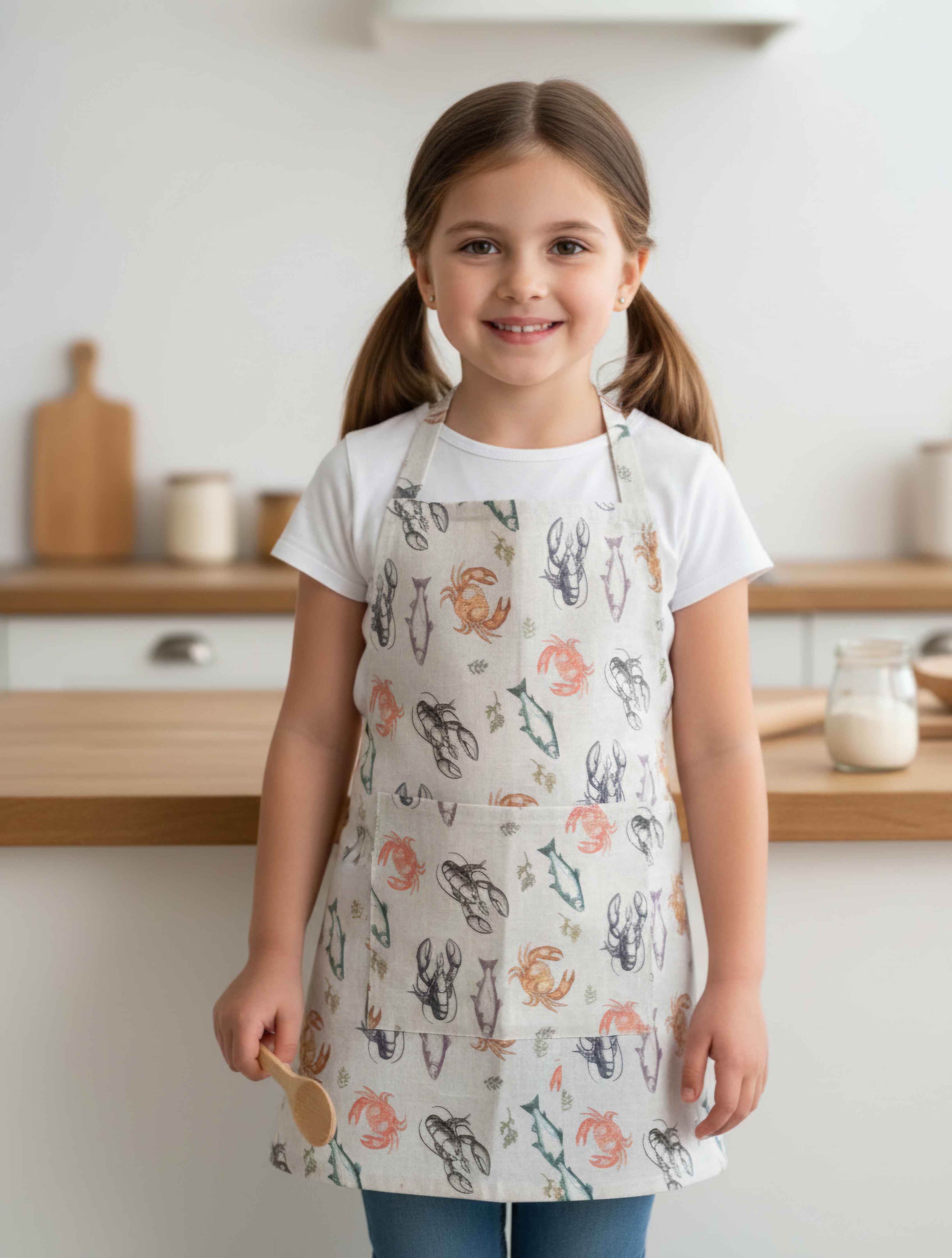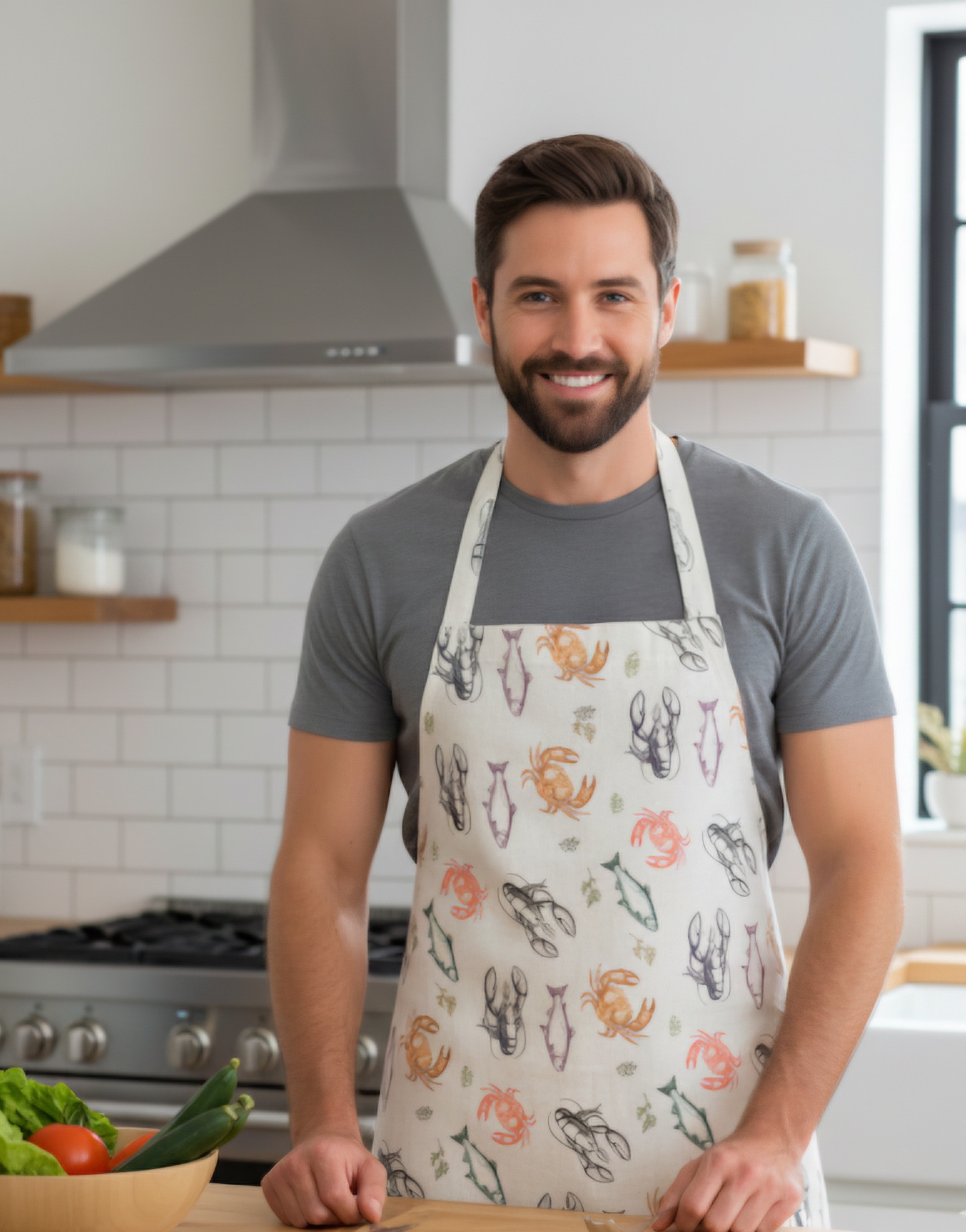 Stilinga ir praktiška medvilninė prijuostė kasdieniam naudojimui virtuvėje. Natūralaus audinio pagrindas užtikrina komfortą, o žaismingi jūros gėrybių motyvai suteikia išskirtinumo ir jaukumo.