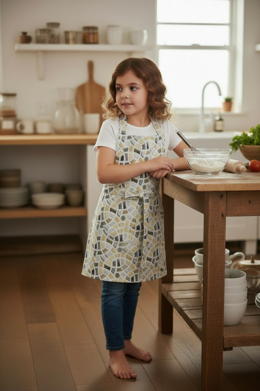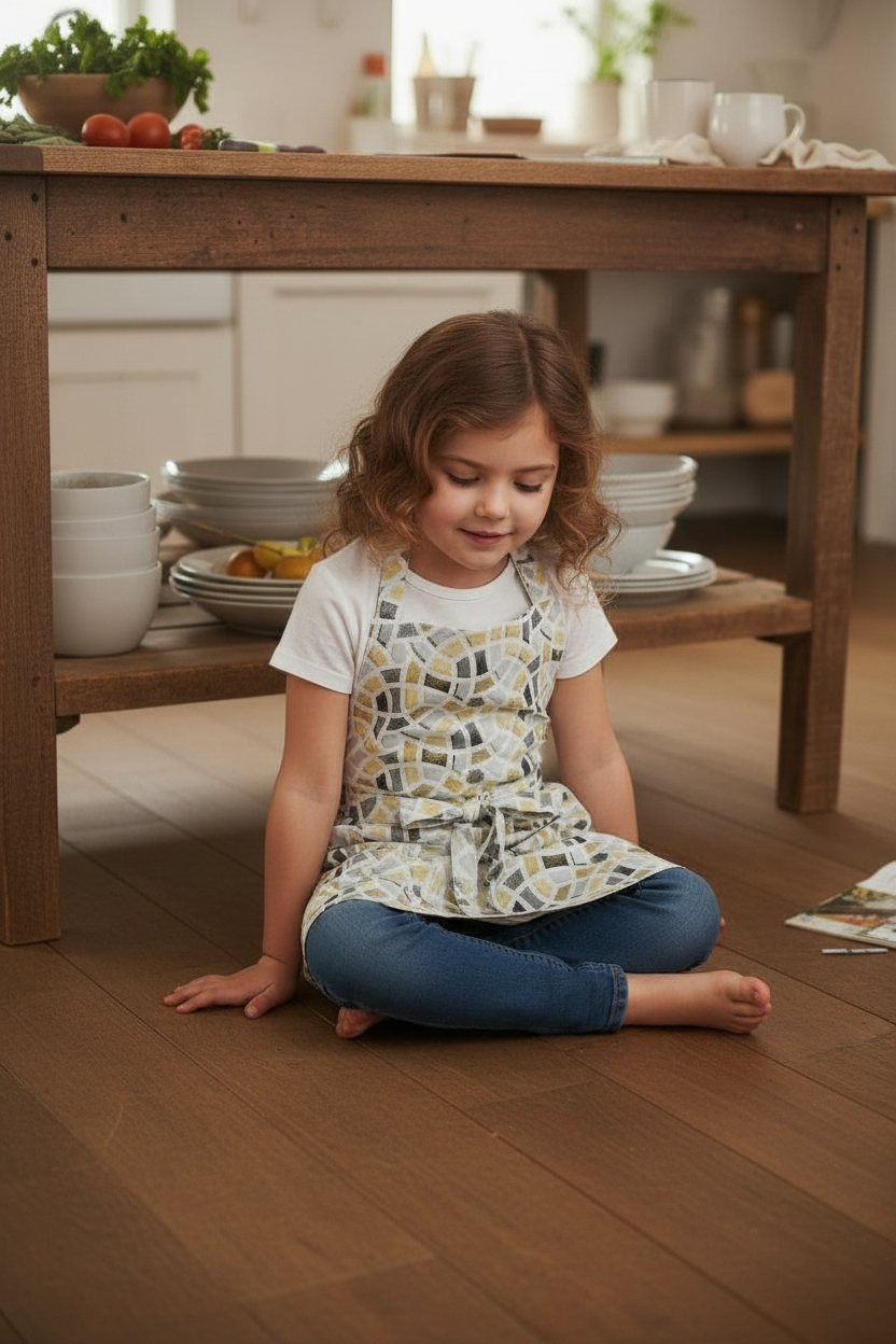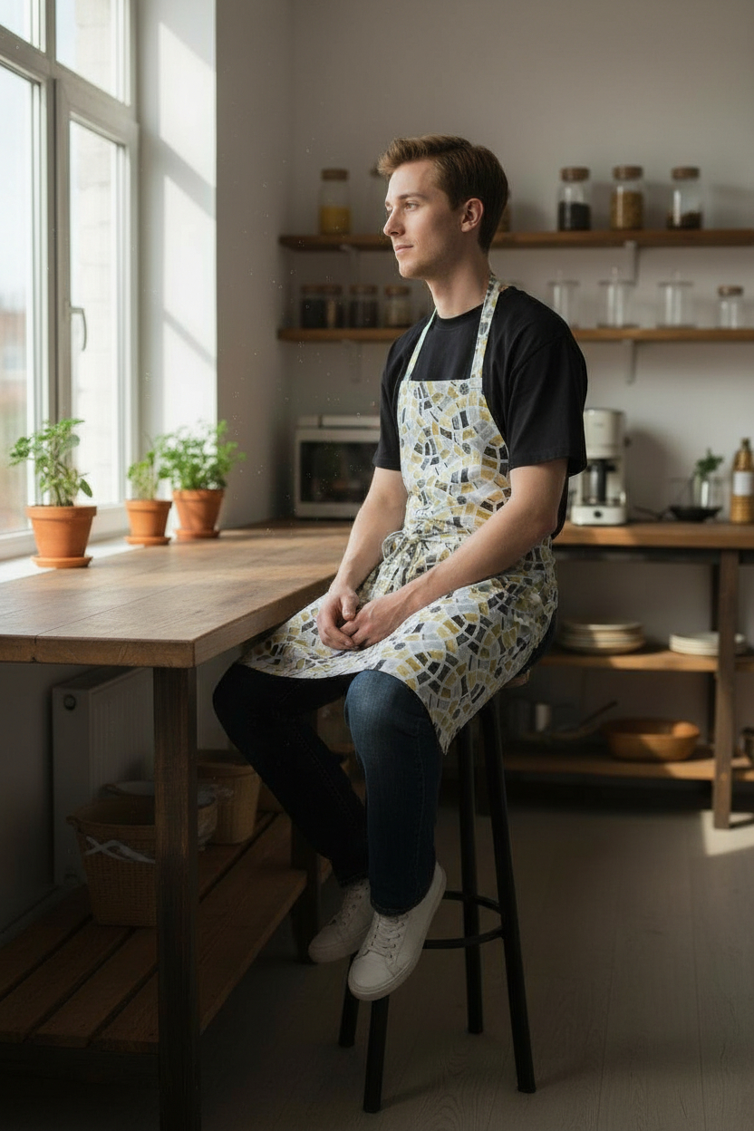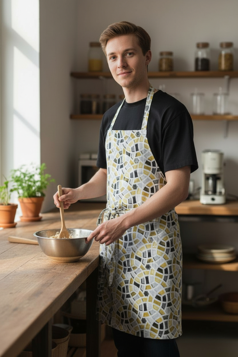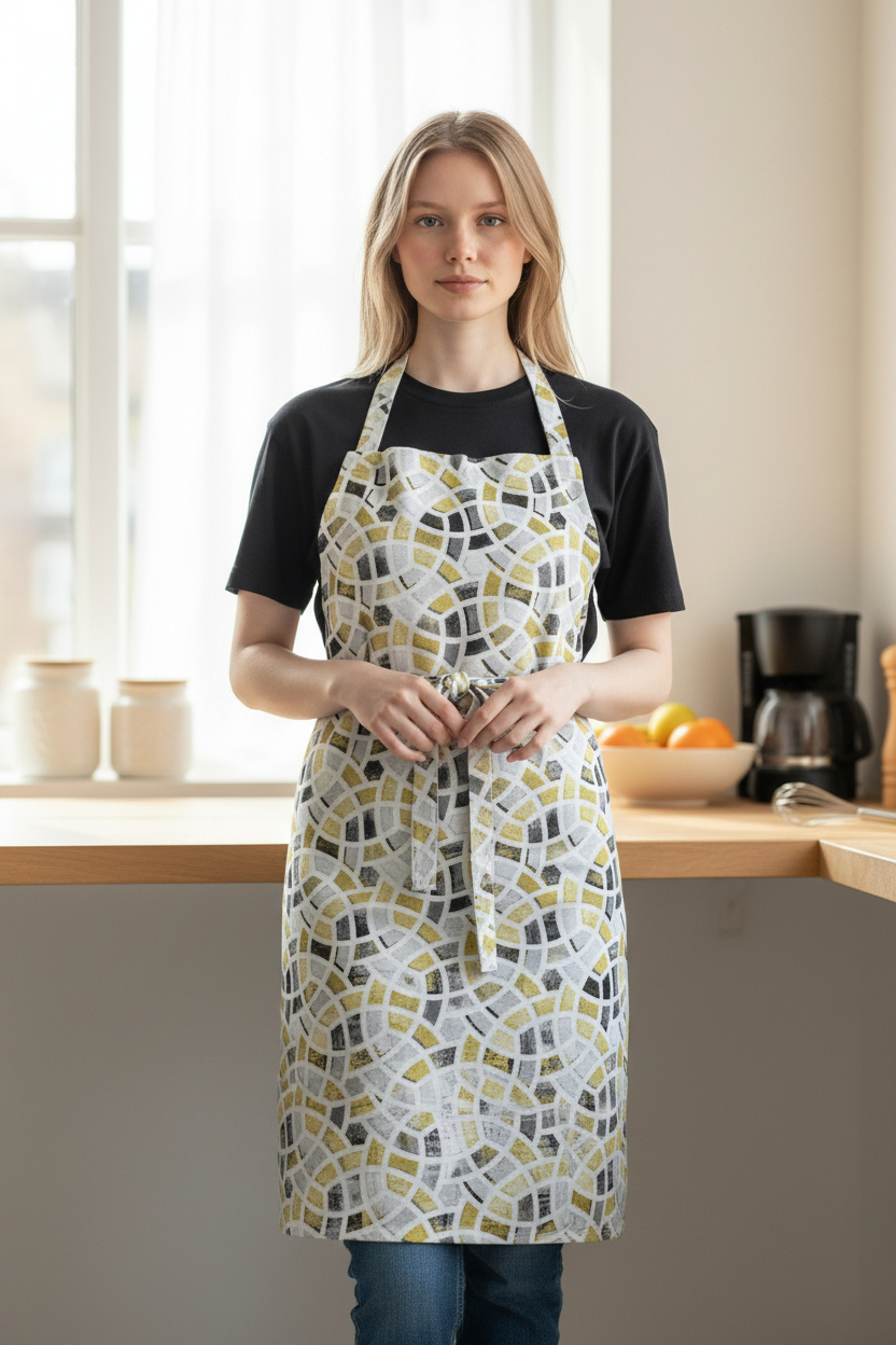 Šviesaus pagrindo prijuostė su moderniu geometriniu raštu, kuriame dera pilki, juodi ir garstyčių geltonumo tonai. Raštas sudarytas iš pasikartojančių arkų ir segmentų, suteikiančių prijuostei šiuolaikišką, tvarkingą ir universaliai derinamą išvaizdą.