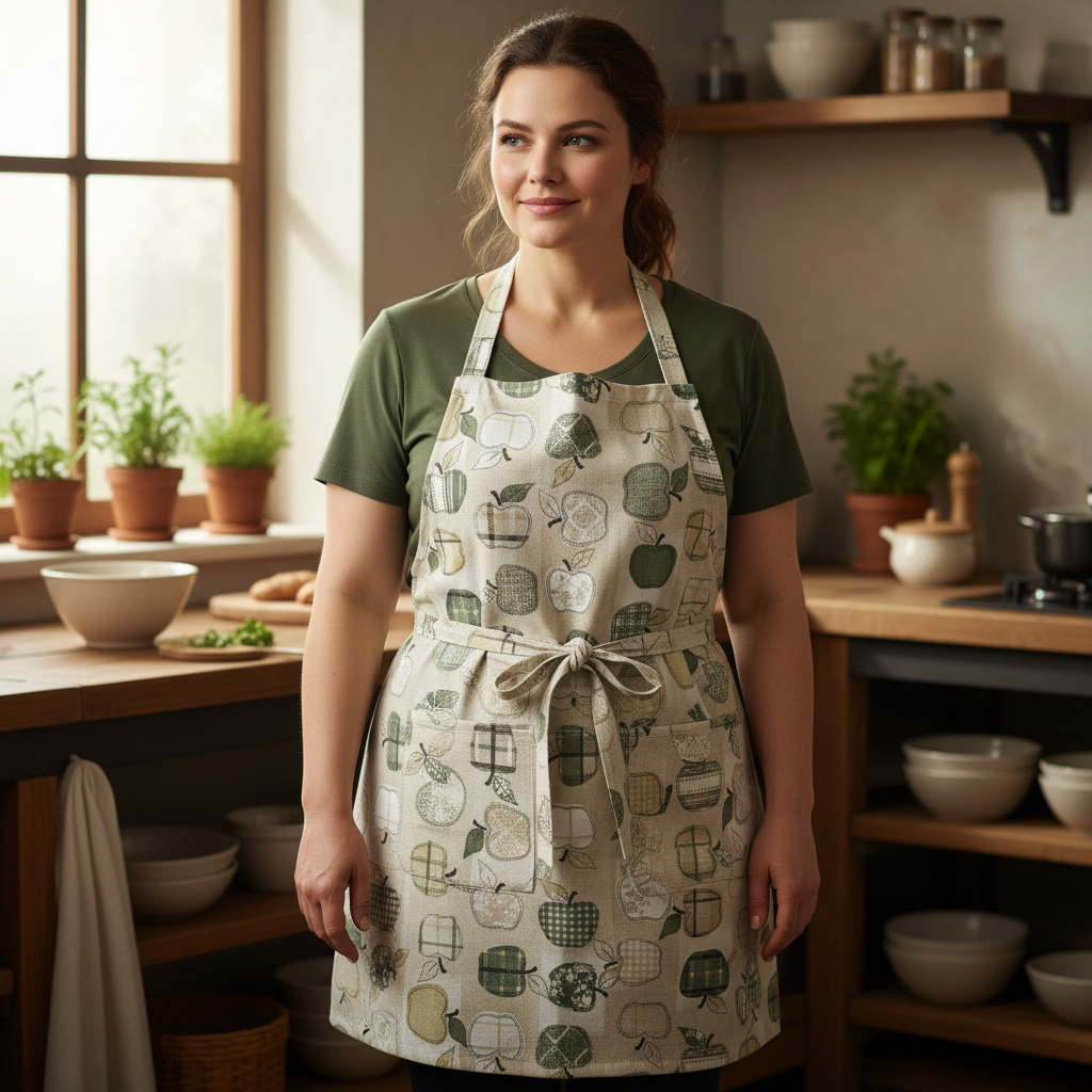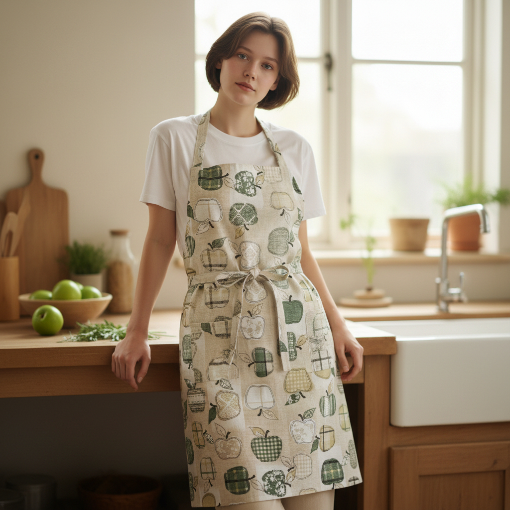 Prijuostė pasiūta iš natūralios medvilnės, todėl yra lengva, kvėpuojanti ir maloni dėvėti. Priekyje esanti talpi kišenė patogi smulkiems daiktams ar virtuvės reikmenims laikyti. Prijuostė užrišama raišteliais, todėl lengvai prisitaiko prie skirtingo ūgio ir sudėjimo. Audinys lengvai prižiūrimas, tinkamas dažnam skalbimui.