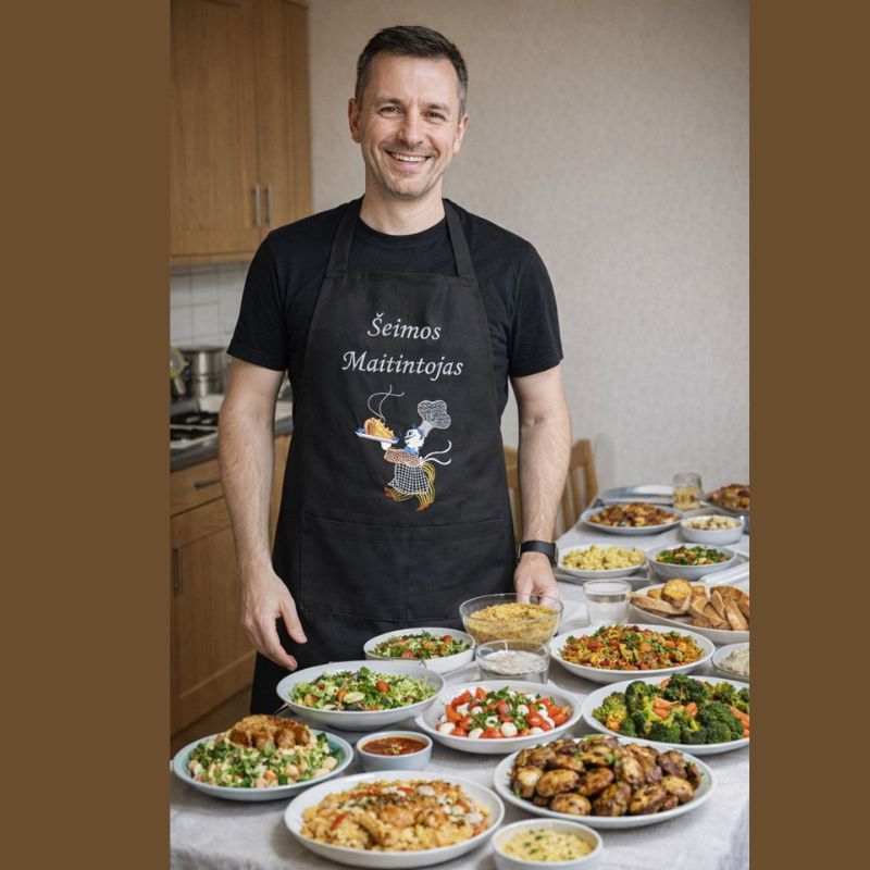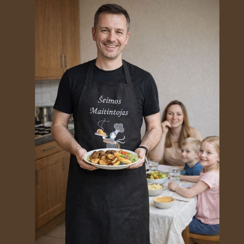 Ši juodos medvilnės prijuostė – su šypsena ir pagarba tiems, kurie rūpinasi, kad šeima būtų soti ir laiminga. Užrašas „Šeimos maitintojas“ kartu su žaismingu siuvinėtu motyvu suteikia prijuostei jaukumo, humoro ir šilto šeimyniško charakterio.