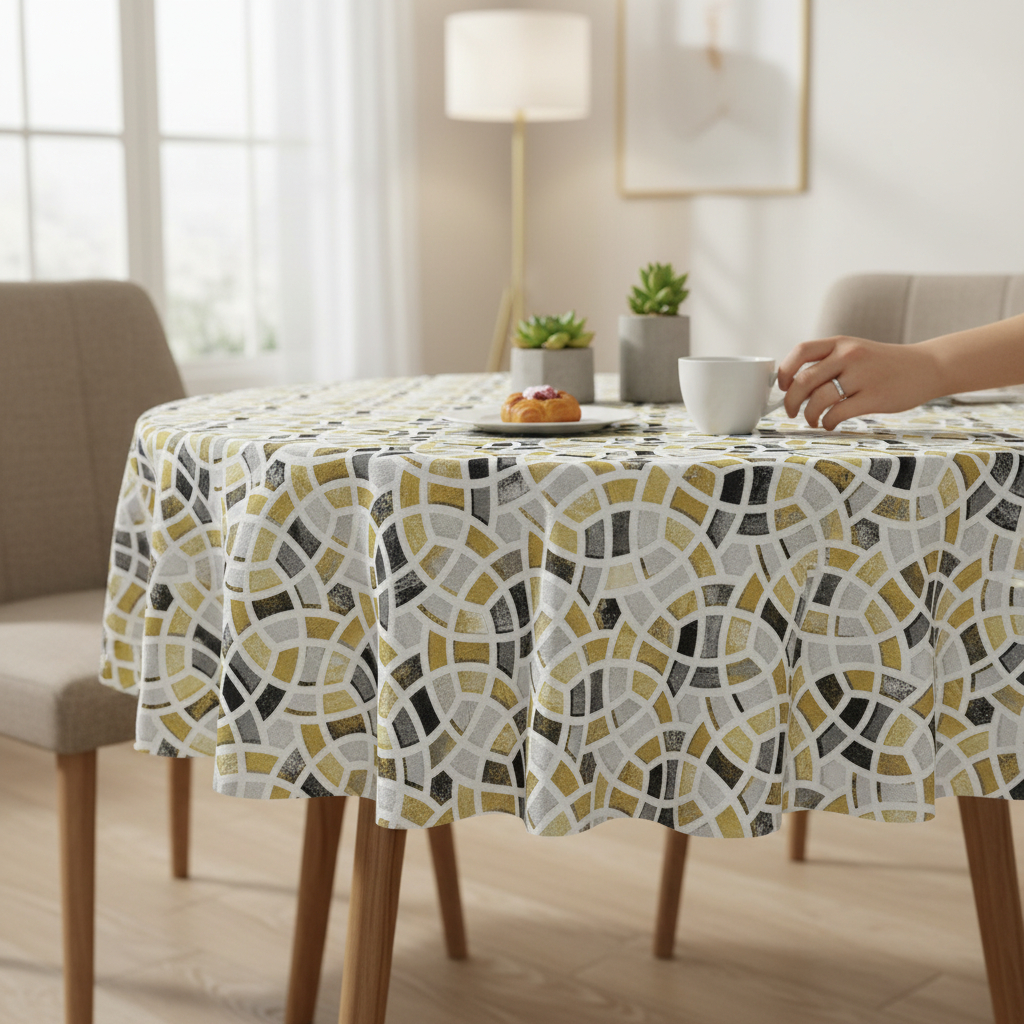 Apvali staltiesė iš natūralios medvilnės, dekoruota moderniu geometriniu raštu pilkos, juodos ir garstyčių spalvų deriniu. Audinys malonus liesti, gerai krinta ir tvarkingai dengia stalą, sukuriant jaukią bei stilingą valgomojo ar virtuvės atmosferą. Geometrinis raštas suteikia interjerui šiuolaikiškumo, tačiau išlieka lengvai derinamas prie įvairių baldų ir spalvinių sprendimų.