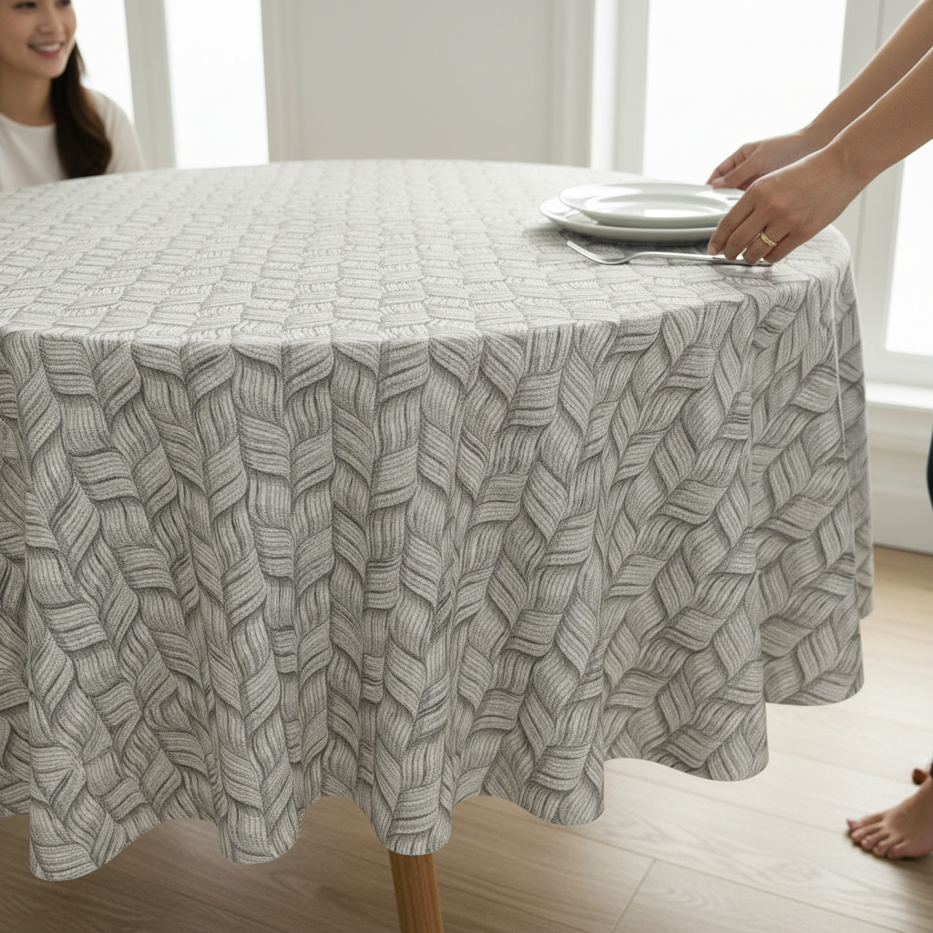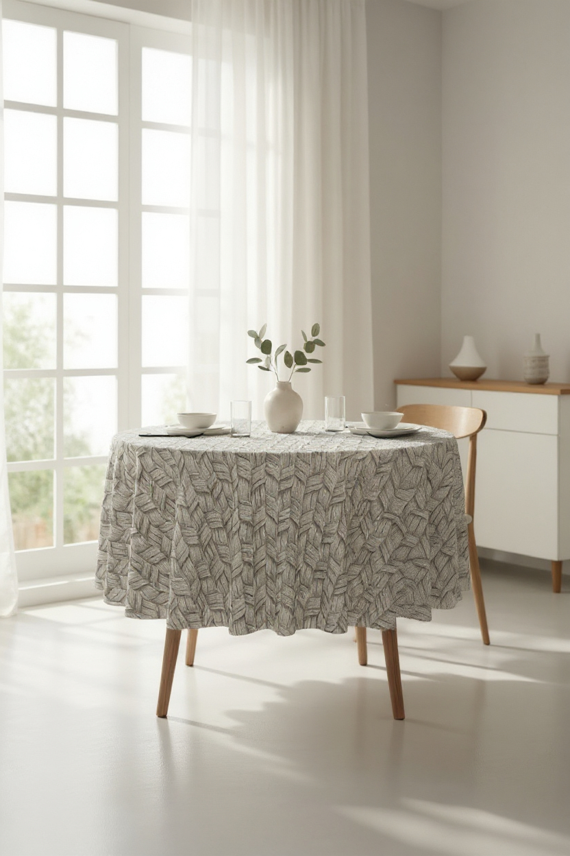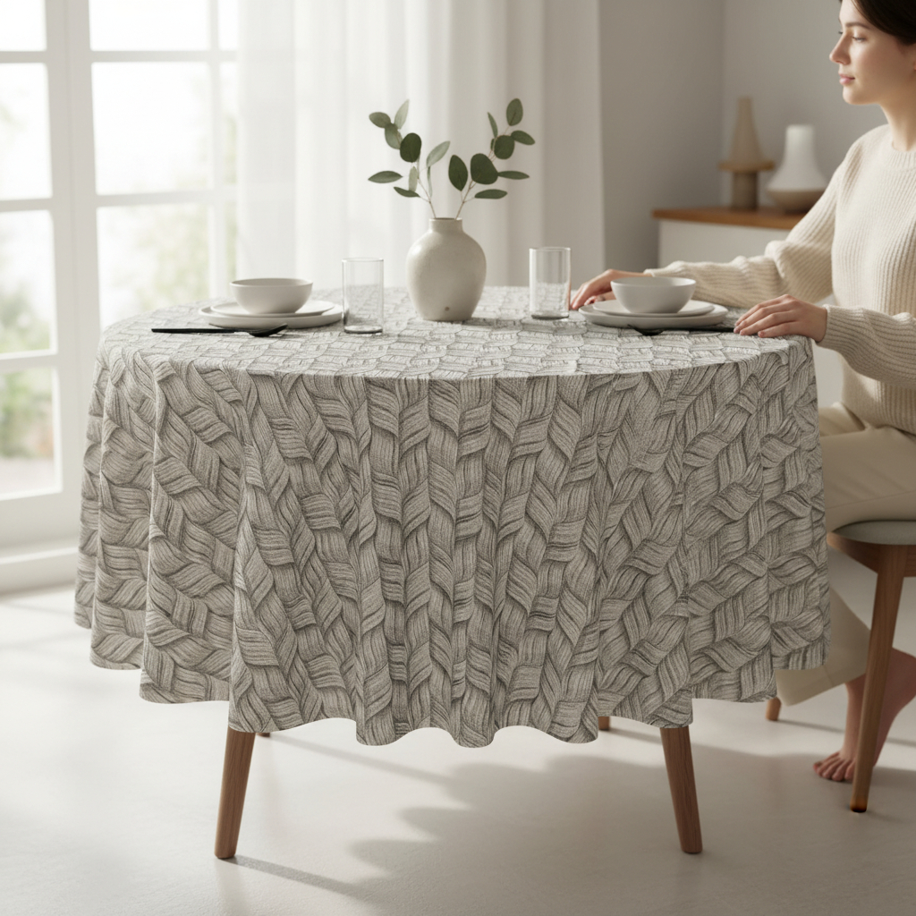 Apvali medvilninė staltiesė su pilkai rudomis kasomis .