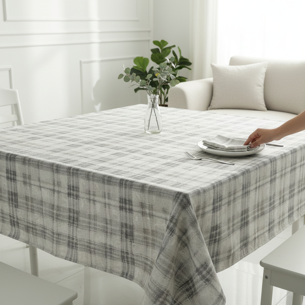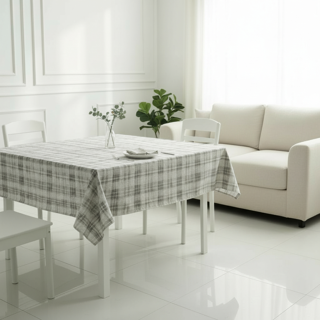 Ši staltiesė su subtiliu languotu raštu išsiskiria ramia, natūralia estetika ir skandinaviško stiliaus lengvumu. Švelnūs pilkšvi atspalviai kuria švaros ir jaukumo pojūtį, todėl staltiesė puikiai tinka tiek kasdieniam naudojimui, tiek ramiems savaitgalio pusryčiams ar vakarienei su šeima.
