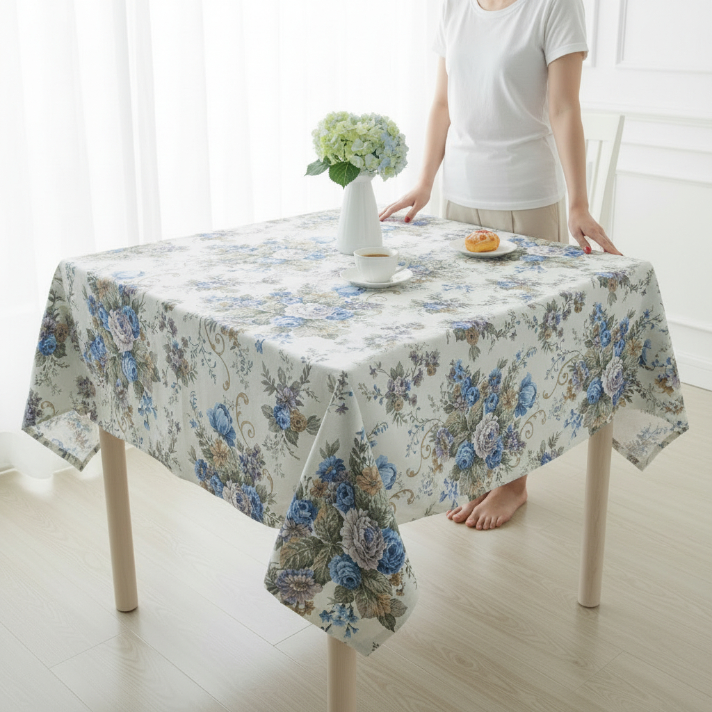 Ši staltiesė su gėlių raštu spinduliuoja klasikine elegancija ir lengvu romantikos pojūčiu. Švelnūs melsvi ir pilkšvi rožių motyvai šviesiame fone kuria jaukią, švarią ir harmoningą stalo nuotaiką. Puikiai tinka tiek kasdieniams pusryčiams, tiek šventiniam stalui ar jaukiems savaitgalio susibūrimams.